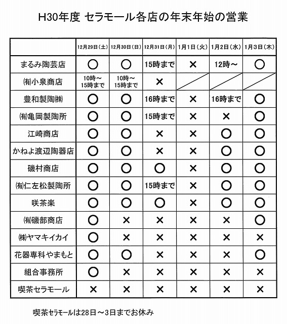 2018年 12月 2018.12.16 セラモール年末年始の営業 日頃皆様にはせモラールをご愛顧いただき、ありがとうございます。 年末年始の営業日をお知らせいたします。 各店によって異なりますので、下記の表をご参照ください。 本年も大変お世話になりました。来年もよろしくお願いいたします。 店舗一覧 Facebook 随時更新中… セラモール - とこなめ焼卸団地